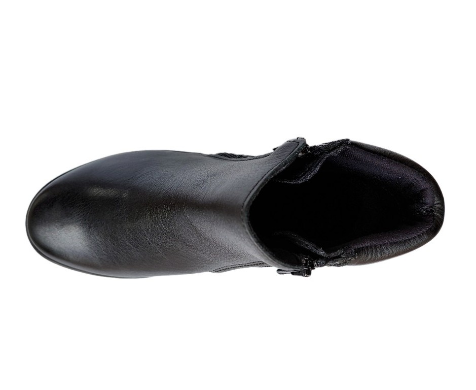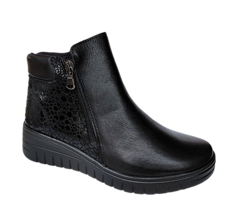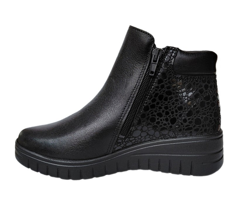 Portania fekete színű, sarok részen lakk díszítésű, mindkét oldalán cipzáros női bélelt bokacsizma