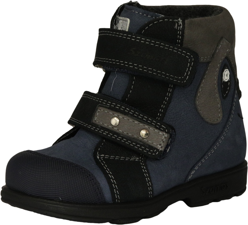Szamos két tépőzáras, kék-szürke színű, Tex-es (vízálló), bélelt fiú csizma, sarkán kutyafej mintával