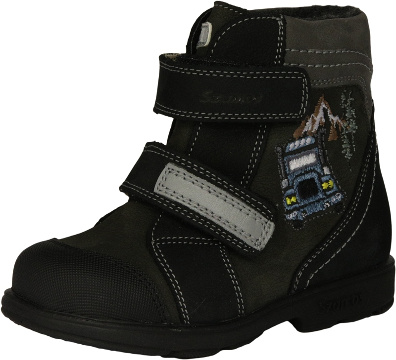 Szamos két tépőzáras, fekete-szürke színű, Tex-es (vízálló), bélelt fiú csizma, oldalán kamion mintával