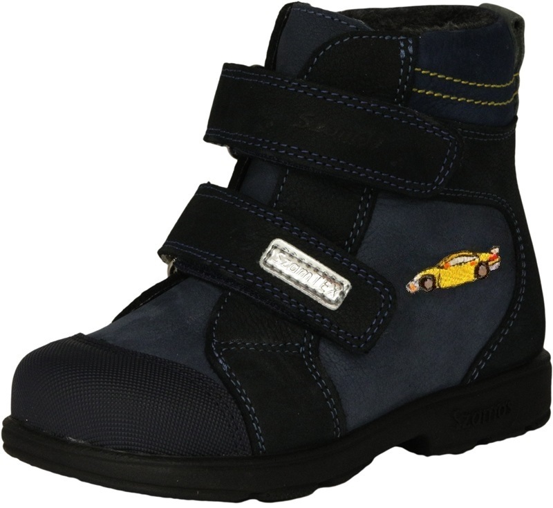 Szamos két tépőzáras, kék-szürke színű, Tex-es (vízálló), bélelt fiú csizma, oldalán autó mintával
