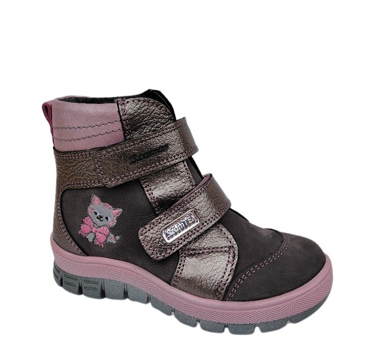 Szamos két tépőzáras, szürke-pink színű, Tex-es (vízálló), bélelt lány csizma, oldalán cica hímzéseel