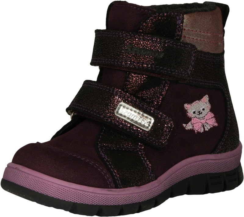 Szamos két tépőzáras, sötétlila színű, Tex-es (vízálló), bélelt lány csizma, oldalán cica hímzéseel