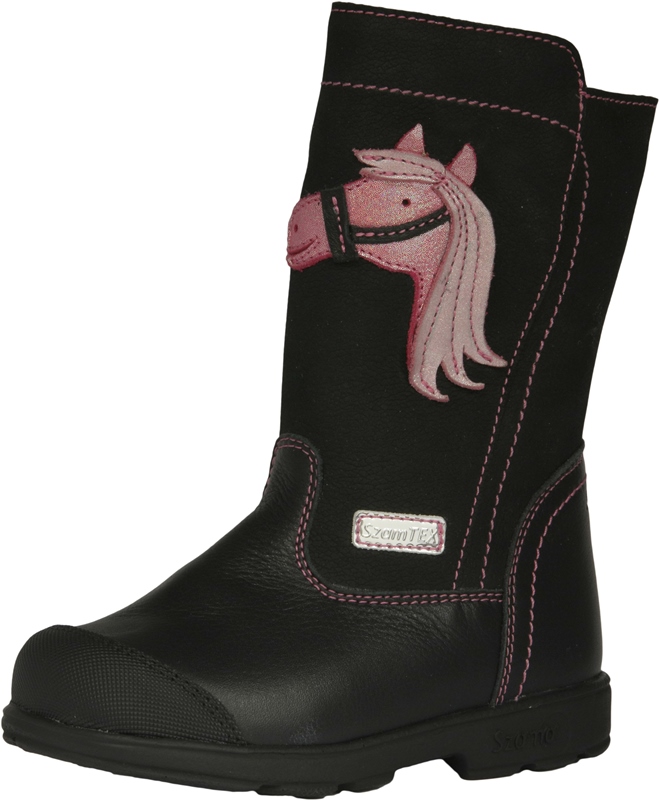 Szamos belső oldalán cipzáros, fekete-pink színű, Tex-es (vízálló), lány bélelt hosszúszárú csizma, szárán lovacska díszítéssel