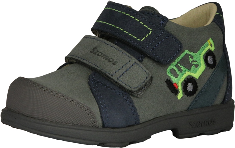Szamos két tépőzáras, szürke-kék színű fiú cipő, oldalán autó mintával