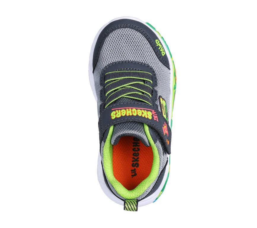 SKECHERS szürke-zöld színű, talpán dínó mintás, tépőzáras és gumifűzős fiú cipő