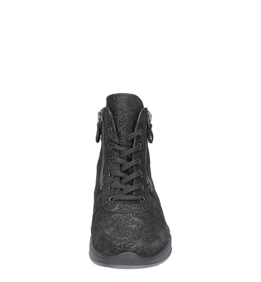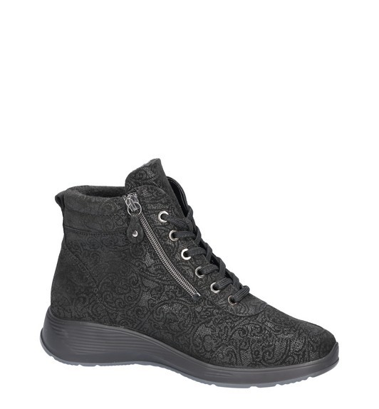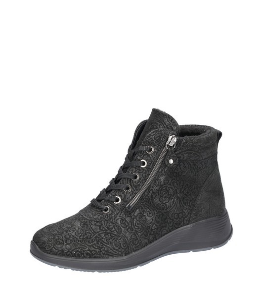 Waldlaufer fekete színű, nyomott mintás, fűzős, külső-belső oldalán cipzáros női bélelt bokacsizma