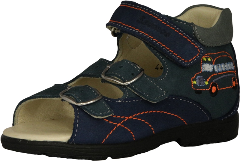 Szamos két csatt, egy tépőzáras, kék-szürke színű fiú szandál, oldalán busz mintával