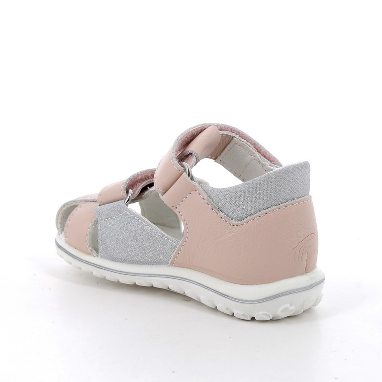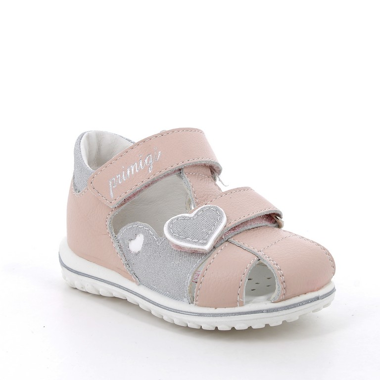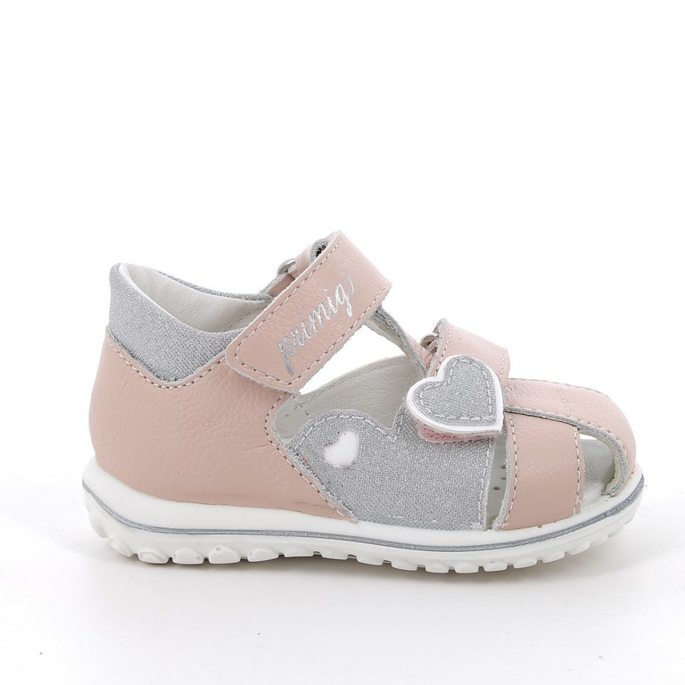 Primgi két tépőzáras, orrvédős, rózsaszín-ezüst színű lány szandál, az oldalán és az elülső pántján szív mintával