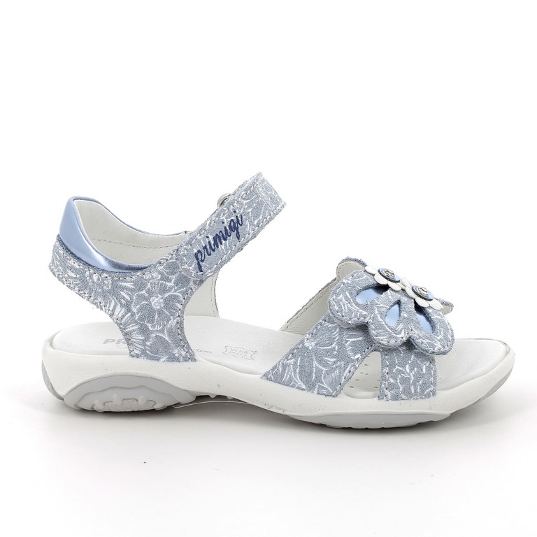 Primigi két tépőzáras, hátul nyitott kérgű, kék-szürke színű lány szandál, virág mintával az első tépőzáron