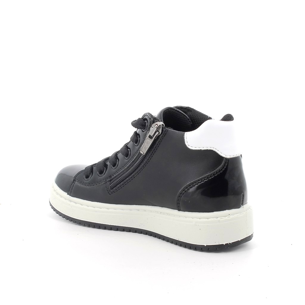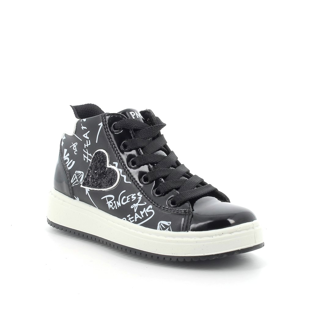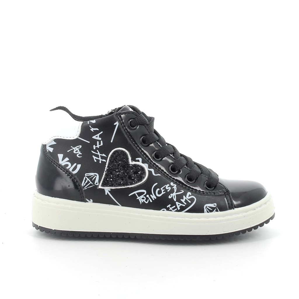 Primigi fűzős és cipzáros, fekete színű lány száras cipő, oldalán felirattal és szív mintával