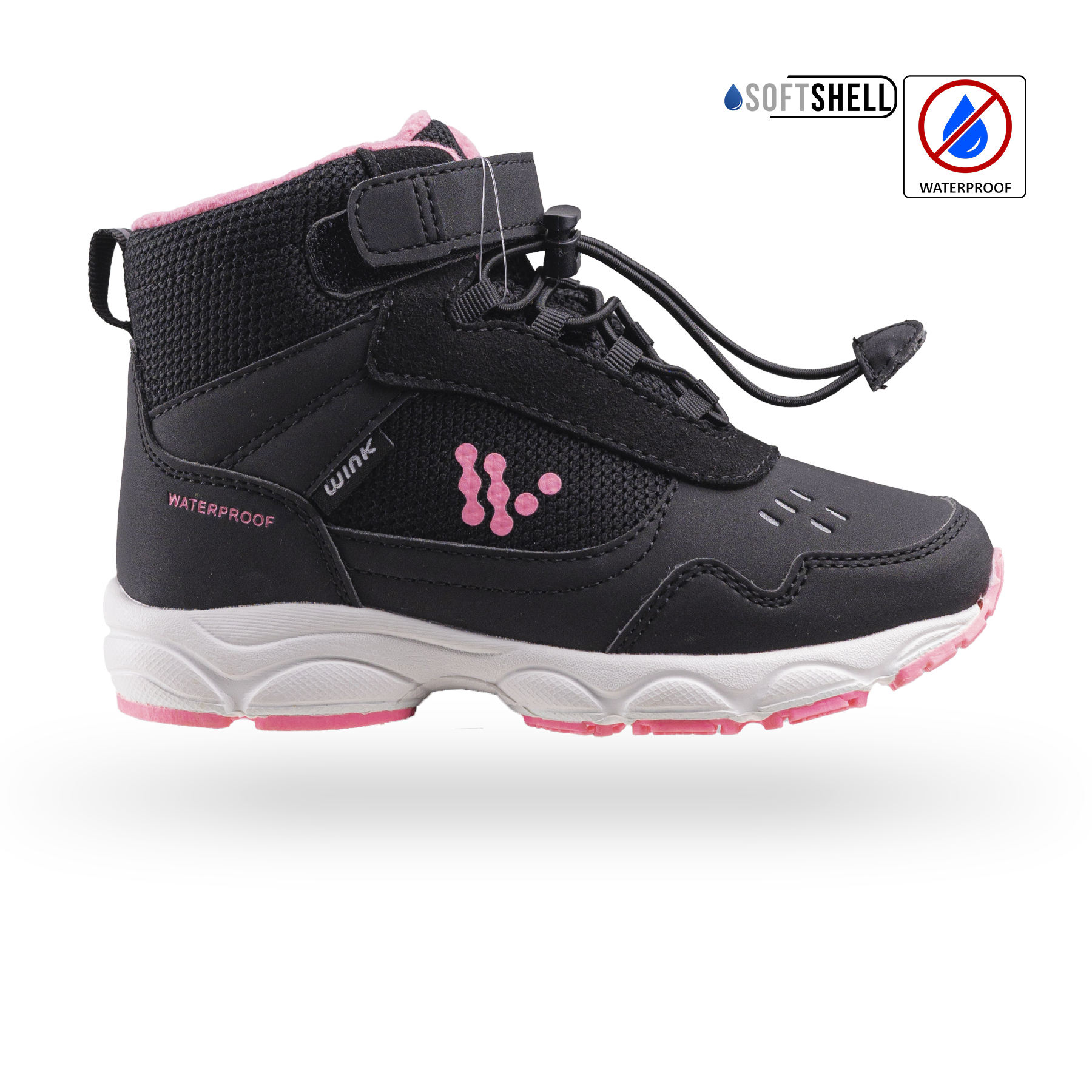 Wink tépőzáras és gumifűzős, fekete-pink színű, vízálló, bélelt lány csizma